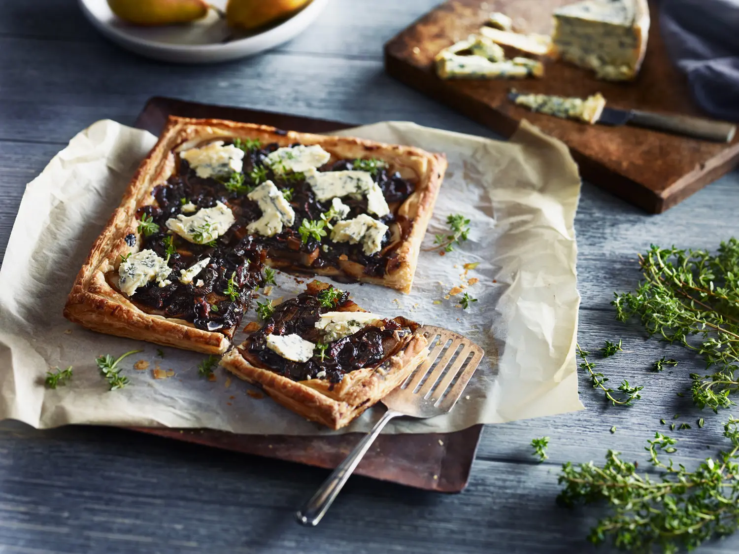 Top hot tart with blue cheese slices and fresh thyme sprigs and serve hot or cold.