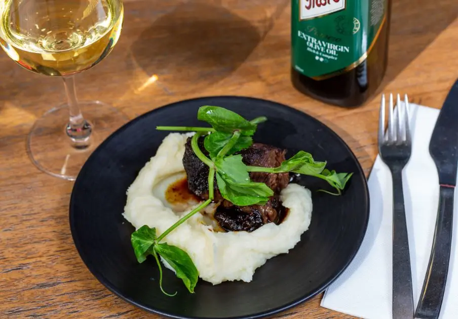 Once cooked remove the beef cheeks and gently divide it into 3-4 pieces and set aside Strain the remaining stock and place in a saucepan.