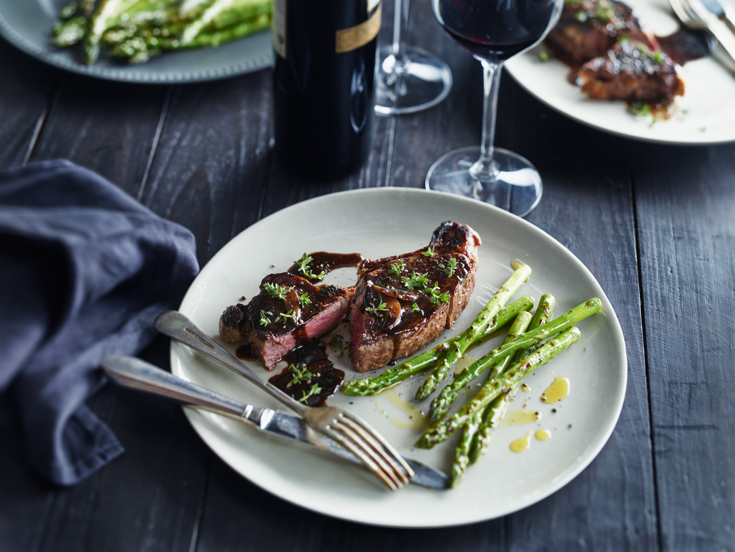 Serve steaks with asparagus and drizzle both with Thyme Balsamic Jus.