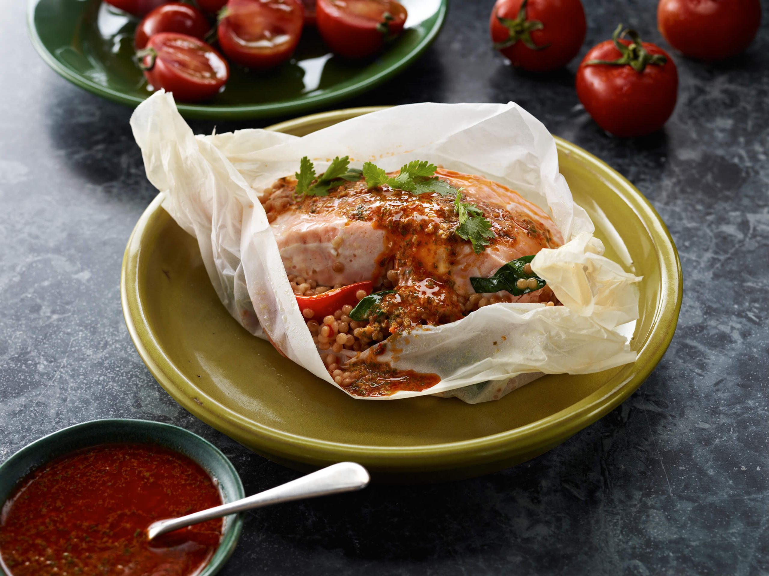 Top with a fish fillet and 2 tablespoons chermoula. Bring corners of paper together and twist tightly to enclose the fish.