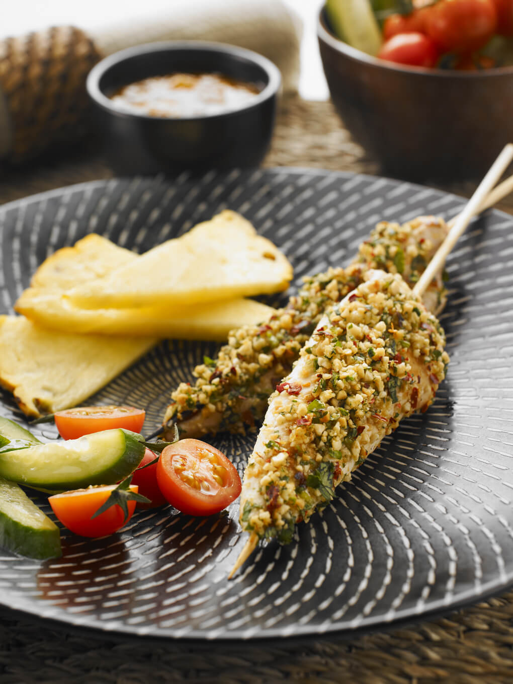 Sprinkle cooked skewers on all sides with chilli peanut mixture.