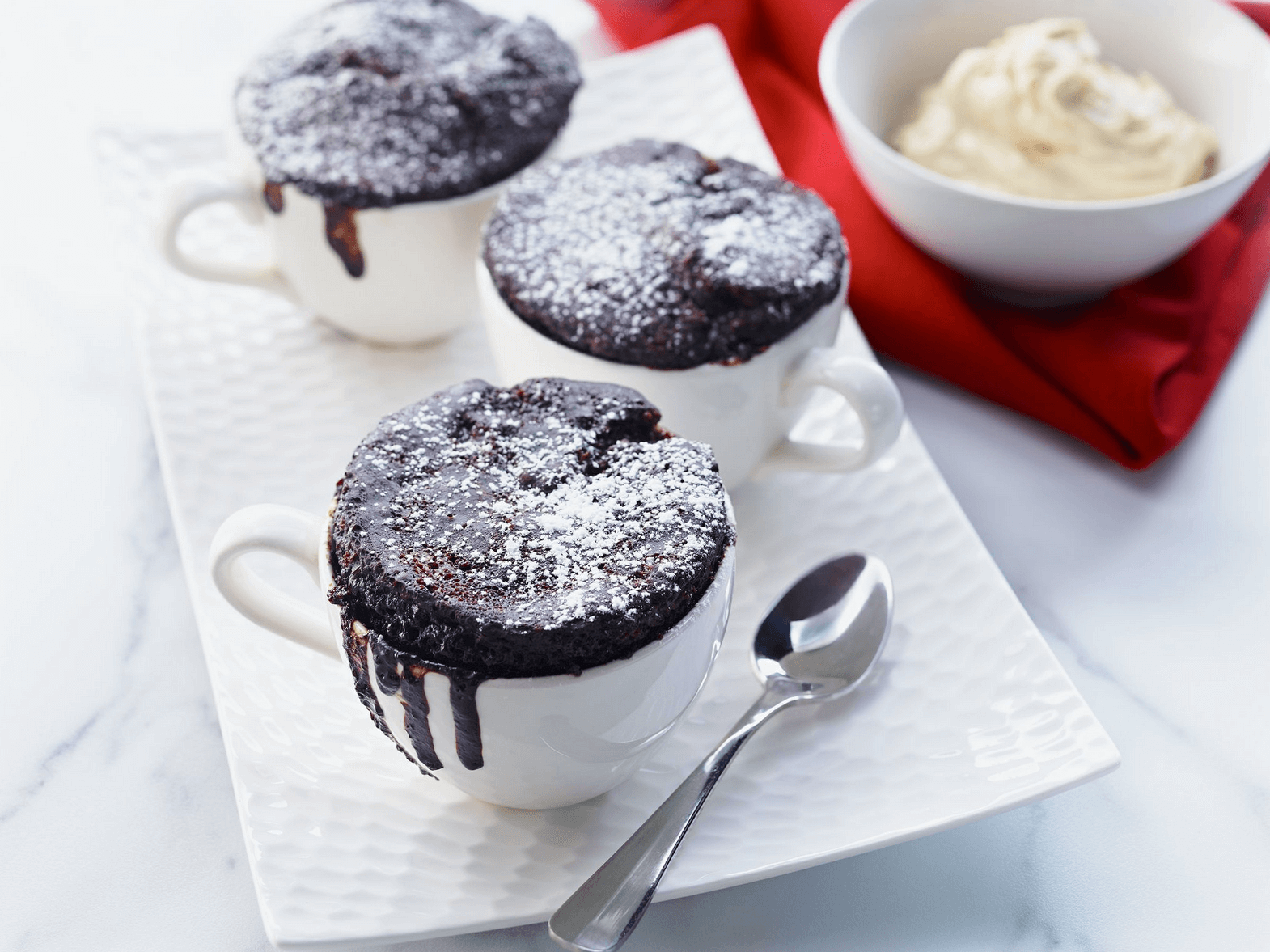 Grease six ovenproof cappuccino cups or ramekins with Moro Delicado Light Taste Olive Oil. Combine flour, cocoa, cinnamon and brown sugar together in a bowl.