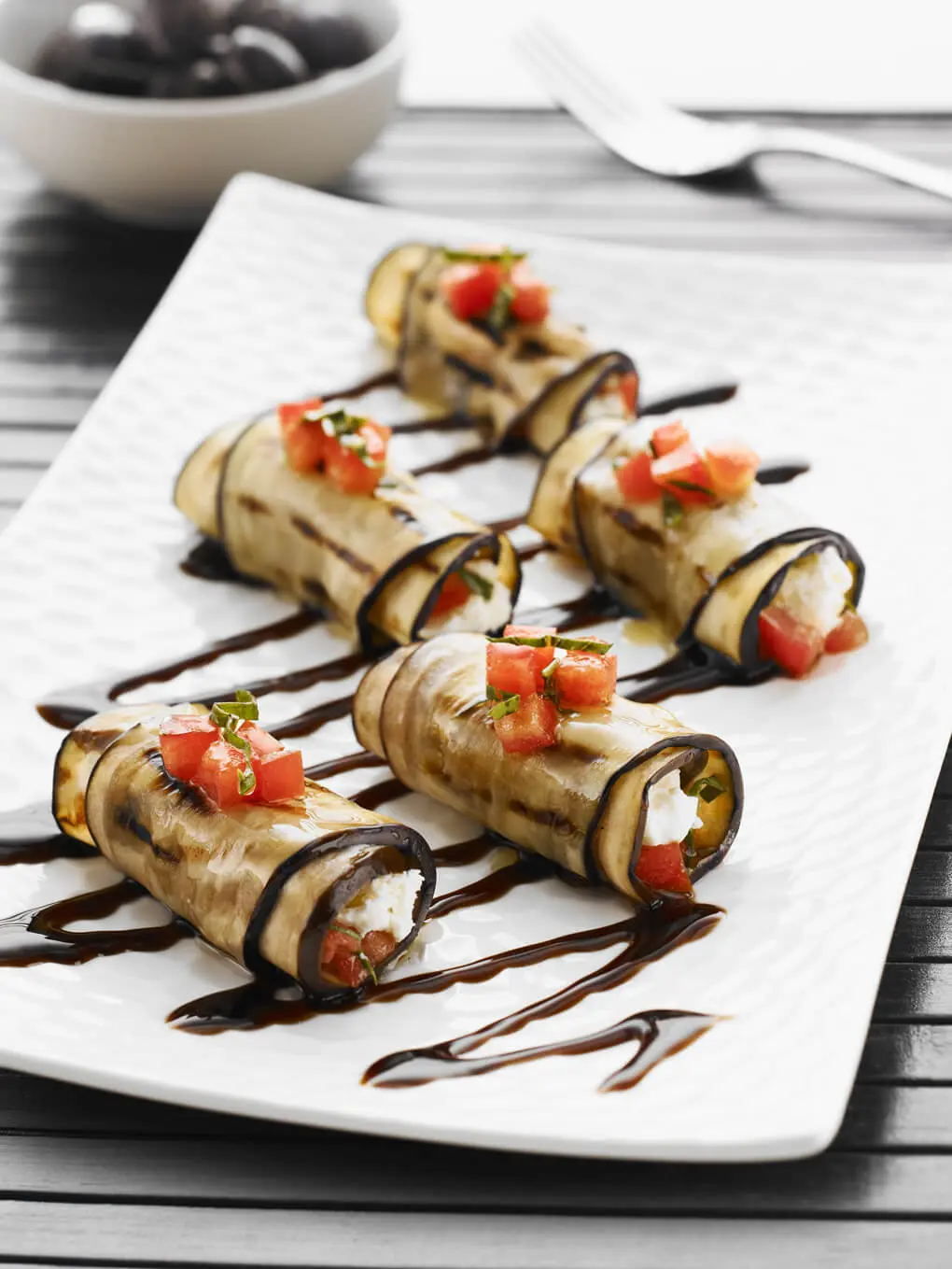 Drizzle Moro Gourmet Italian Glaze decoratively onto serving plates before placing eggplant rolls on top.