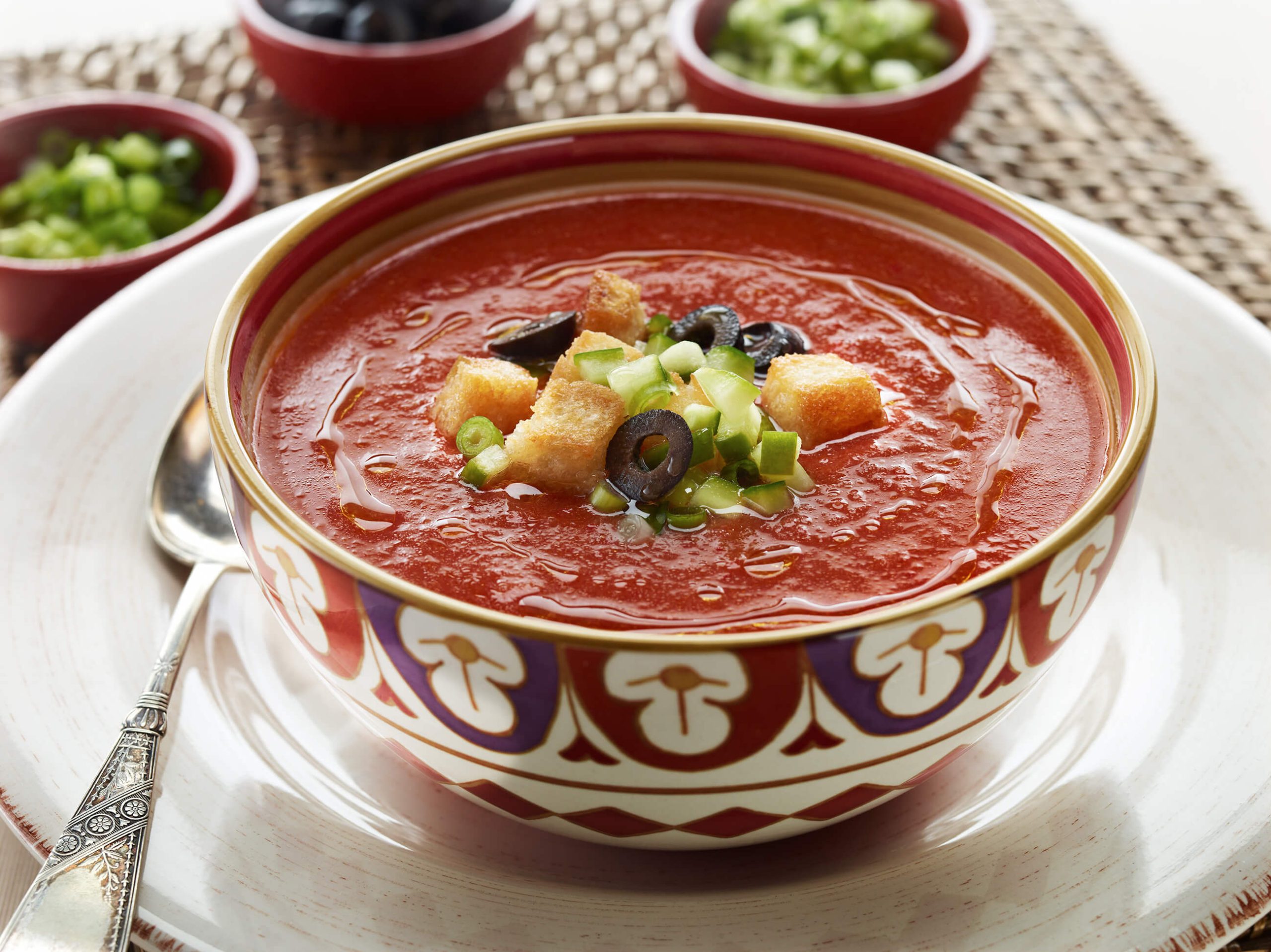 Portion soup into serving bowls, drizzle with olive oil and serve sprinkled with diced vegetables and garlic croutons.