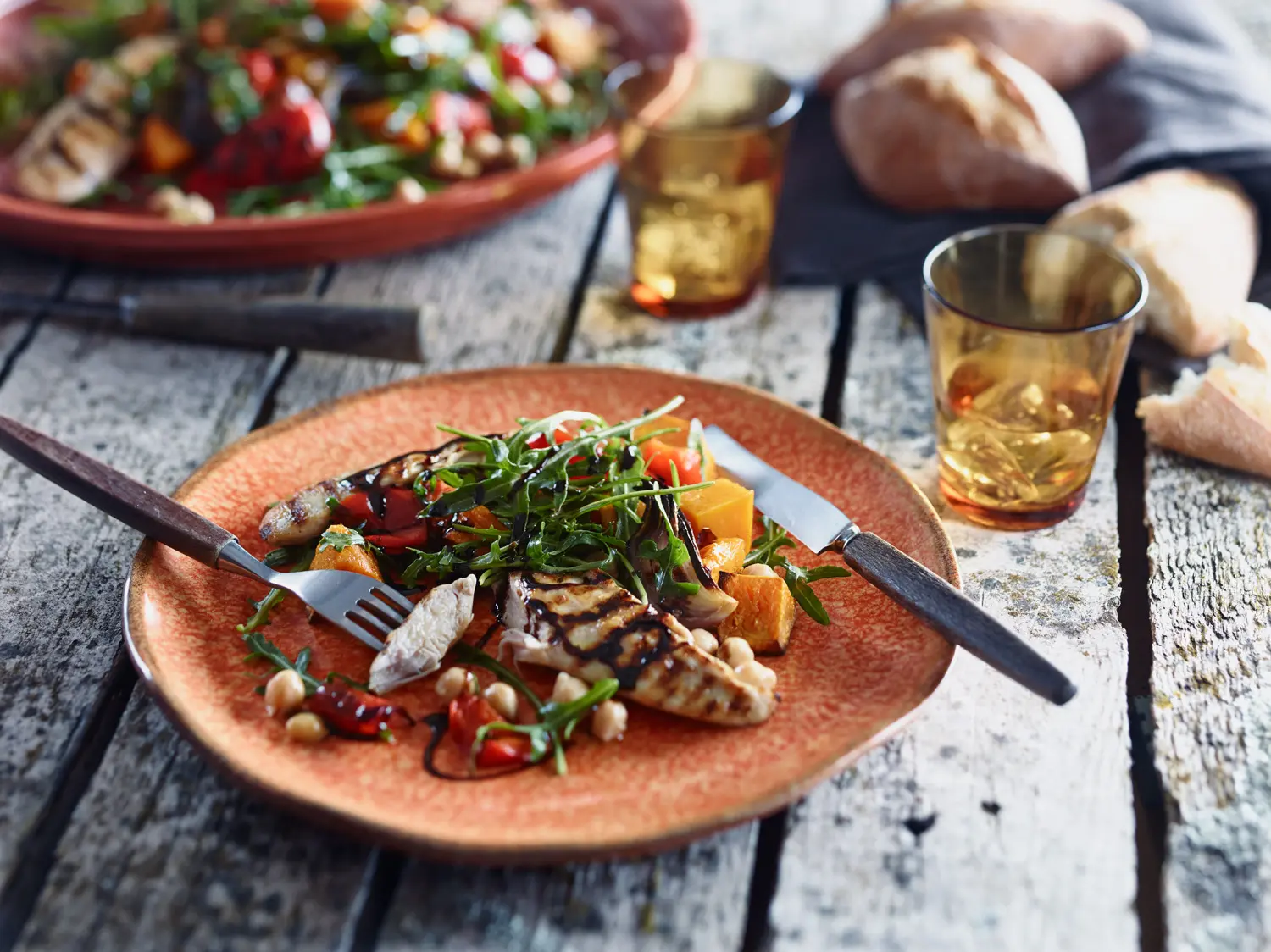 Top with roasted vegetables and chicken, drizzling all generously with Moro Gourmet Italian Glaze.