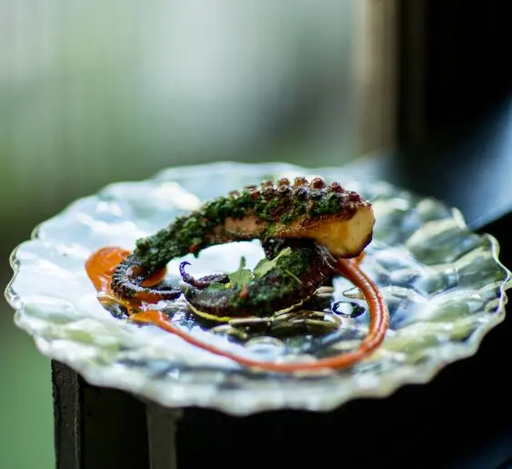Pan sear the octopus leg in a pan with Moro Frutal Extra Virgin Olive Oil until golden brown, remove from pan.