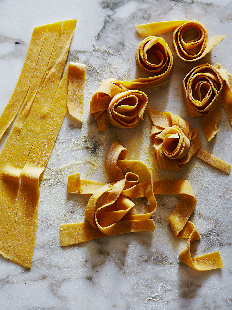 To cut into fettuccine, ensure the pasta is well floured before gently rolling up as for a Swiss roll and cutting into 5mm wide strips.