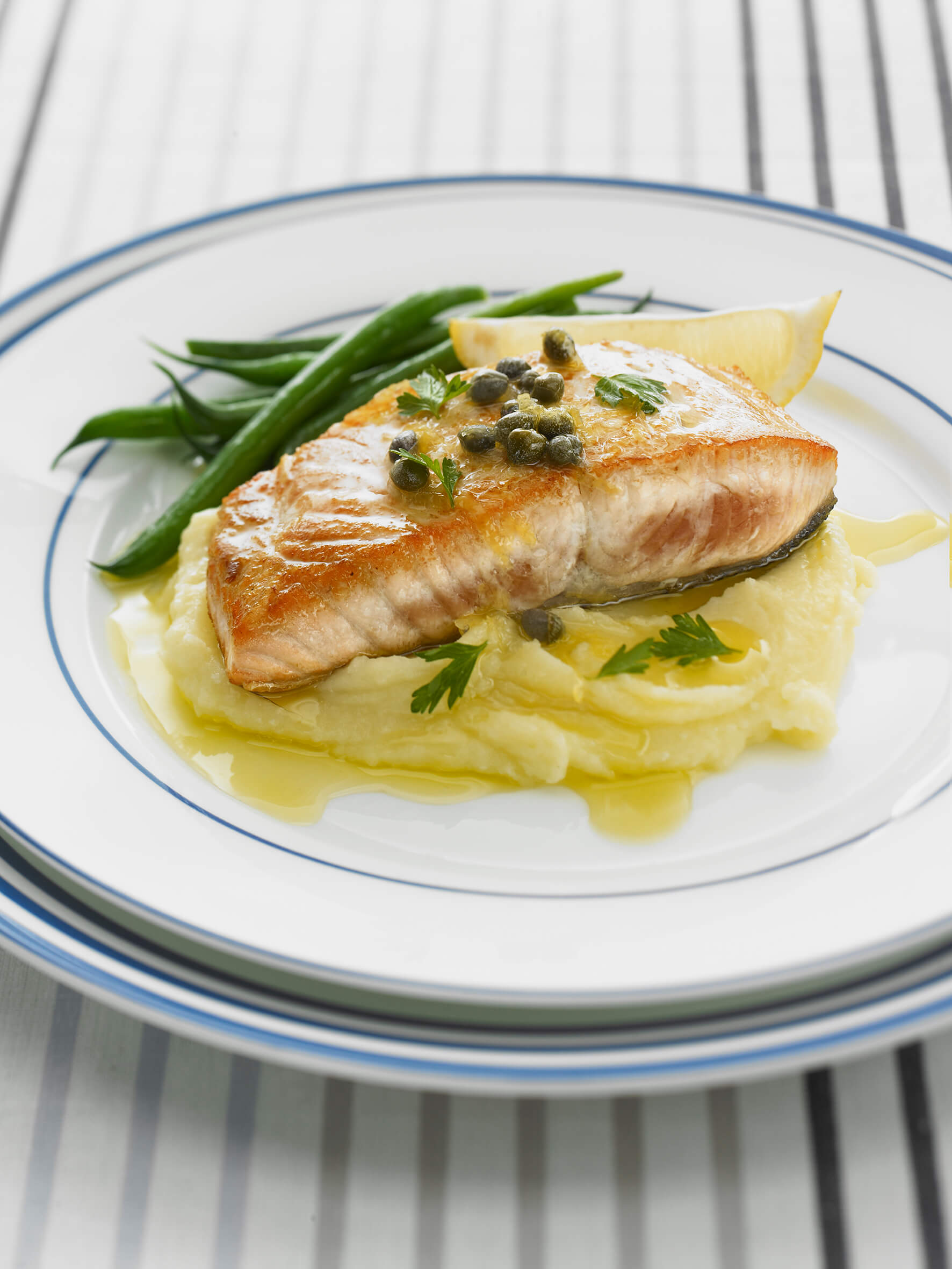 Serve Salmon on Garlic Mash drizzled with Caper and Lemon Oil and accompanied with beans.