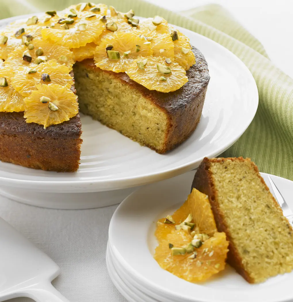 Turn cake out onto a wire rack to cool and garnish with liqueur oranges and reserved pistachios.