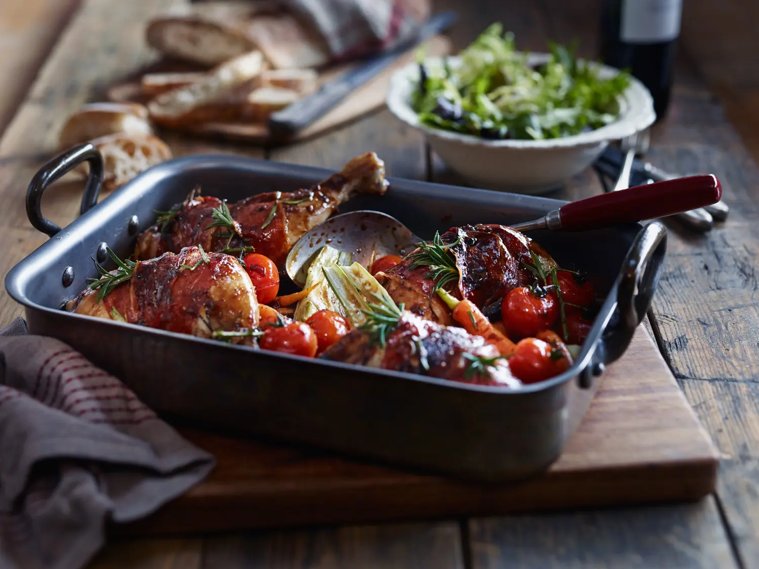 Drizzle chicken with Moro Balsamic Vinegar and roast at 200°C for 45 minutes, basting occasionally, until chicken is cooked and vegetables are tender.