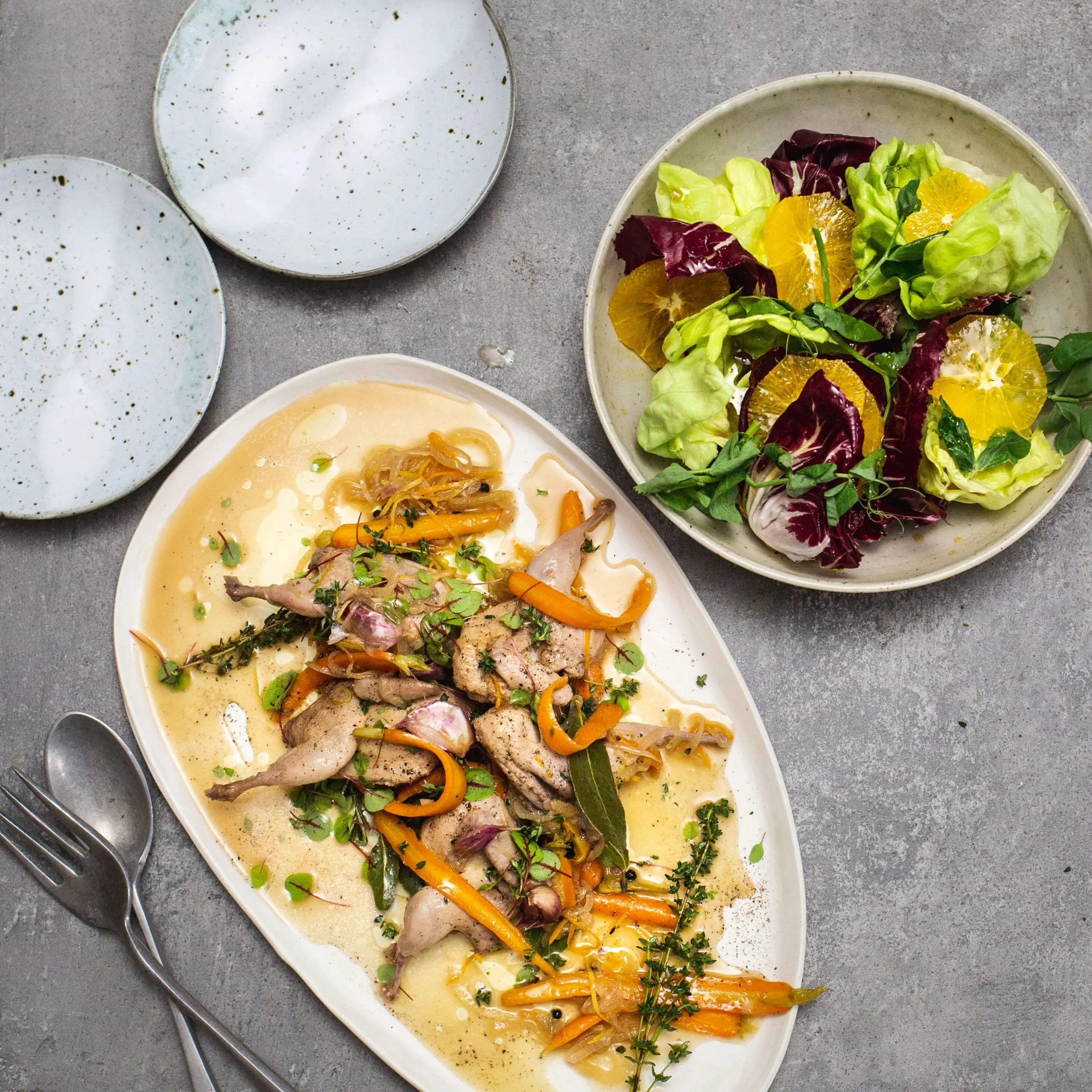 For the salad mix lettuce leaves and oranges slices in a large bowl. Season with salt and black pepper and add 2 tablespoons of the jus of the escabeche to make like a vinaigrette. drizzle with extra olive oil. Serve the quail warm with the salad alongside.