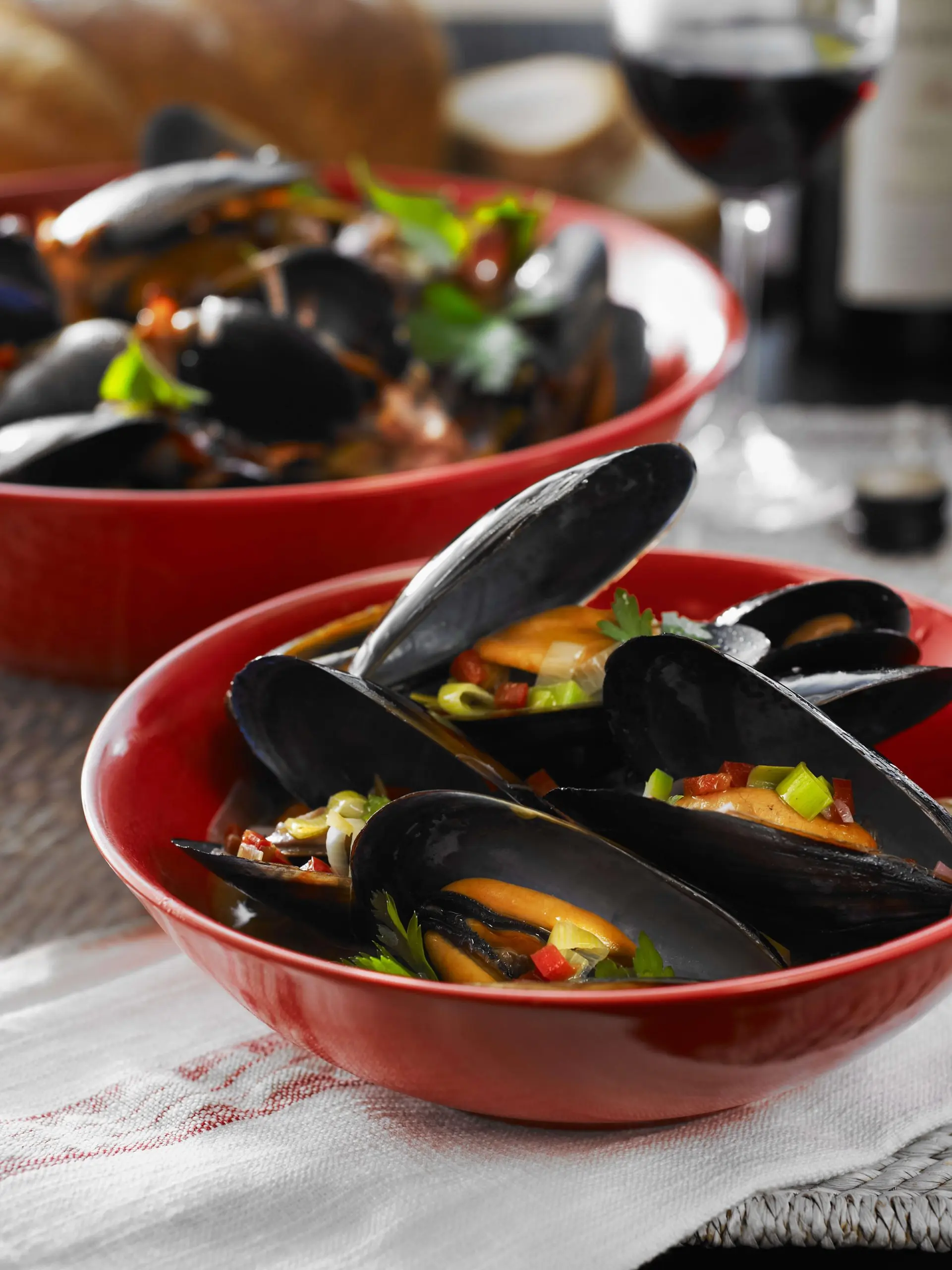 For each serve, place a slice of bread in the bottom of a bowl, top with mussels and red wine sauce and serve sprinkled with crisp pancetta.