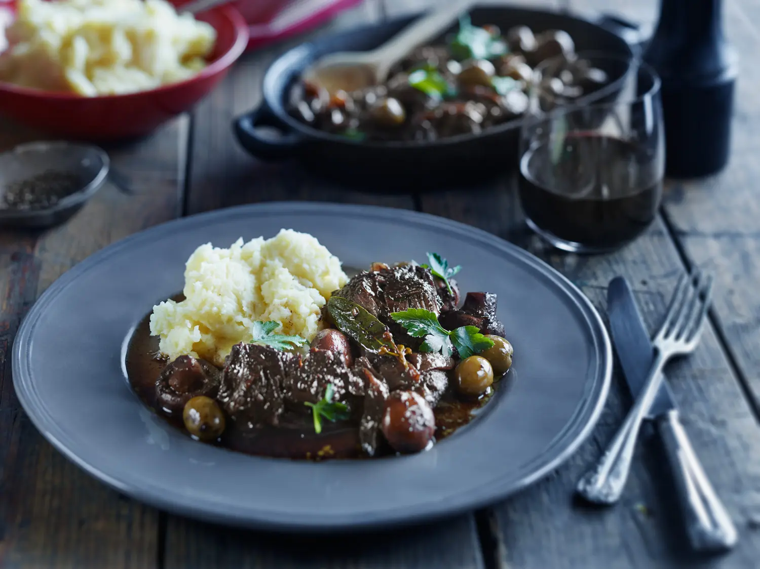 Return beef cheeks to pan with wine, olives and bay leaves and bring to the boil.