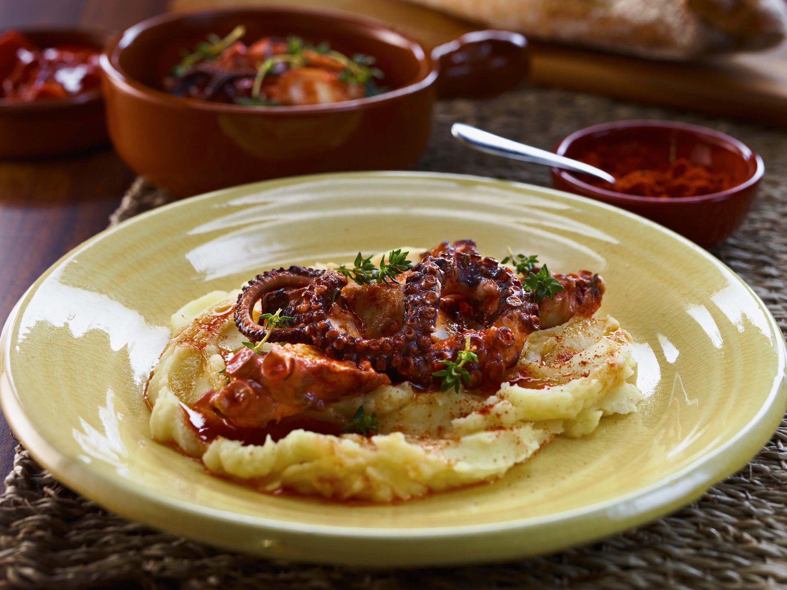 To serve, cut octopus into pieces, spoon potato mash onto individual plates, top with octopus, drizzle with dressing and garnish with thyme leaves.